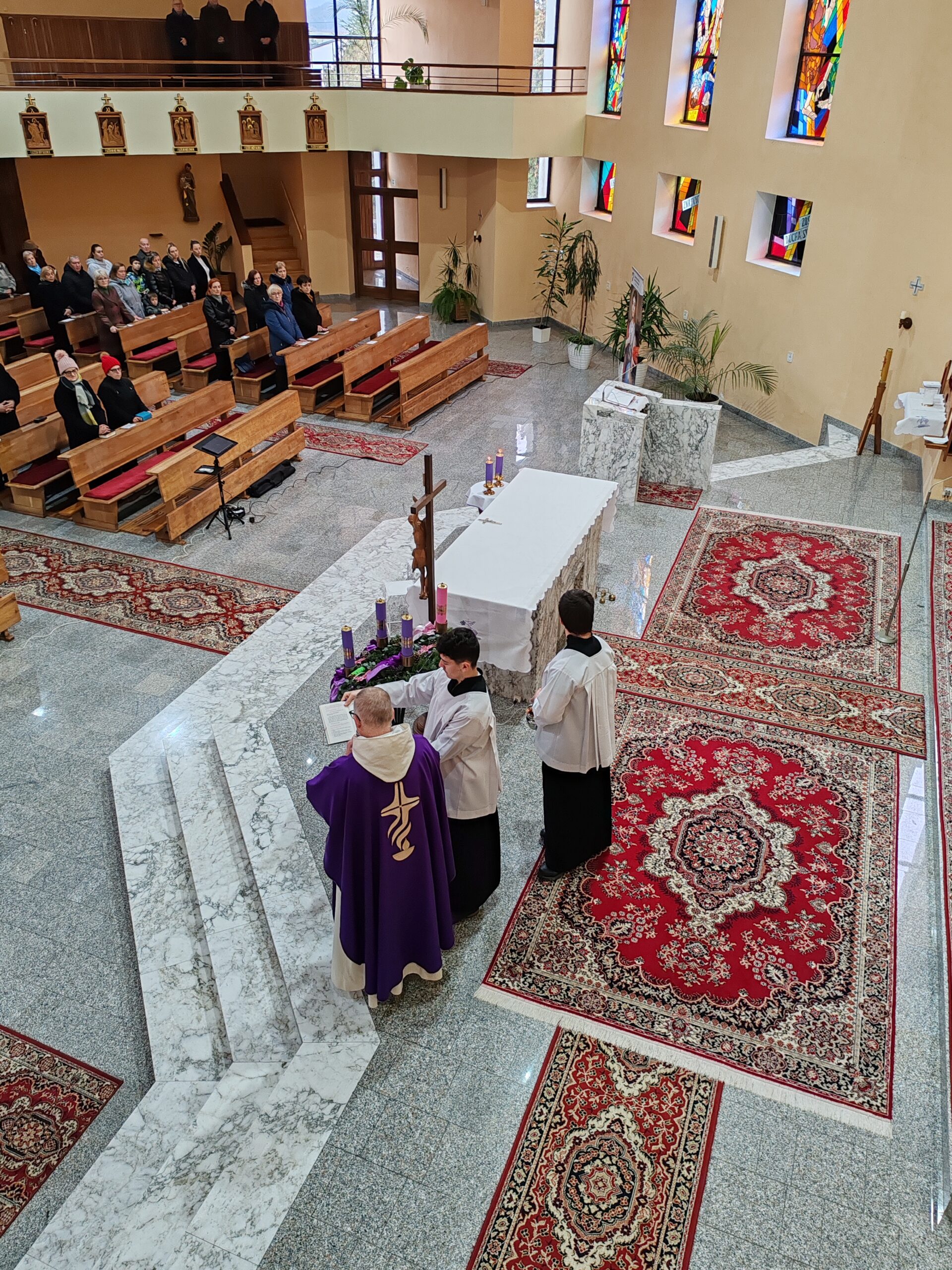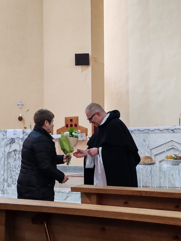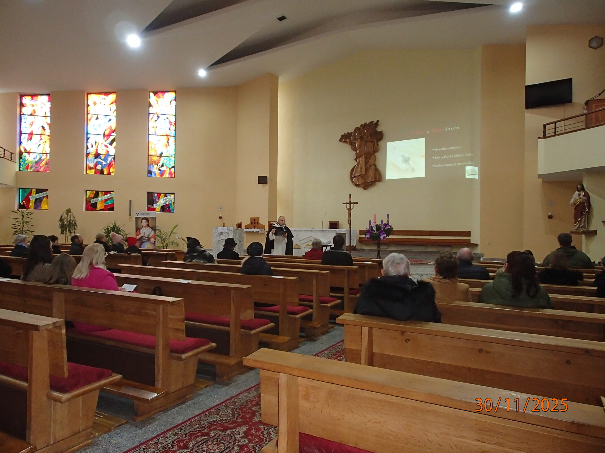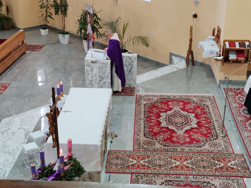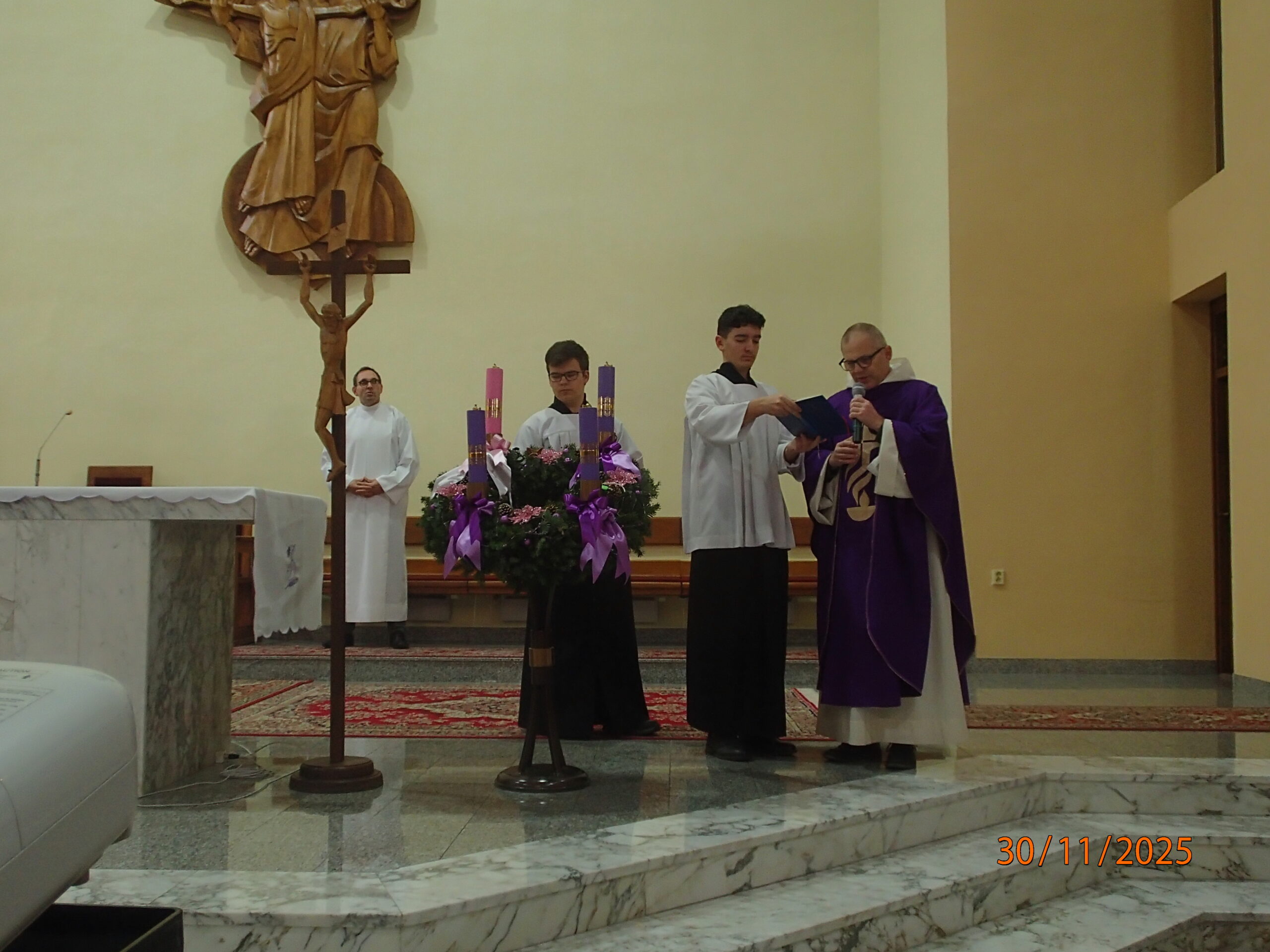 Hlavný celebrant brat Matej na začiatku svätej omše požehnal sviece a veľký adventný veniec, vrátane tých, ktoré si doniesli veriaci. „V advente má Mária významné miesto“ povedal promótor v homílii. Na príklade troch videní Matky Terezy, kde v jednom z nich počula, aby ľudí privádzala k Ježišovi a naučila ich modliť sa ruženec, priblížil túto našu úlohu. Svojou prítomnosťou nás na konci sv. omše poctil aj náš duchovný otec Dušan Lupčo.