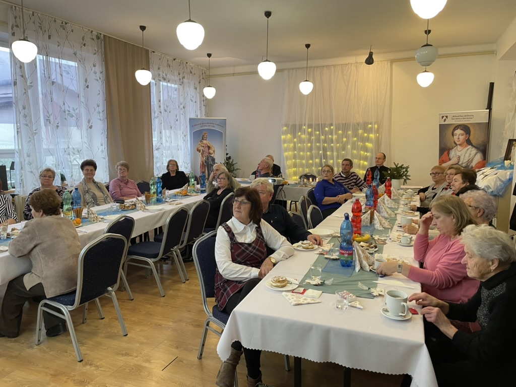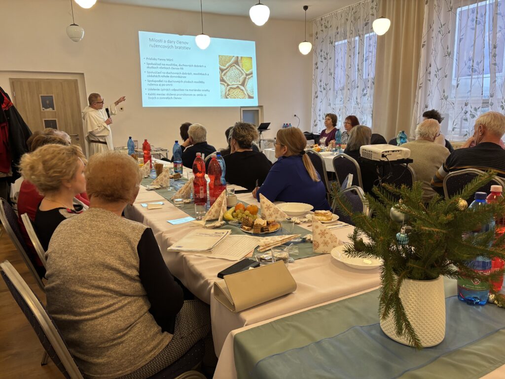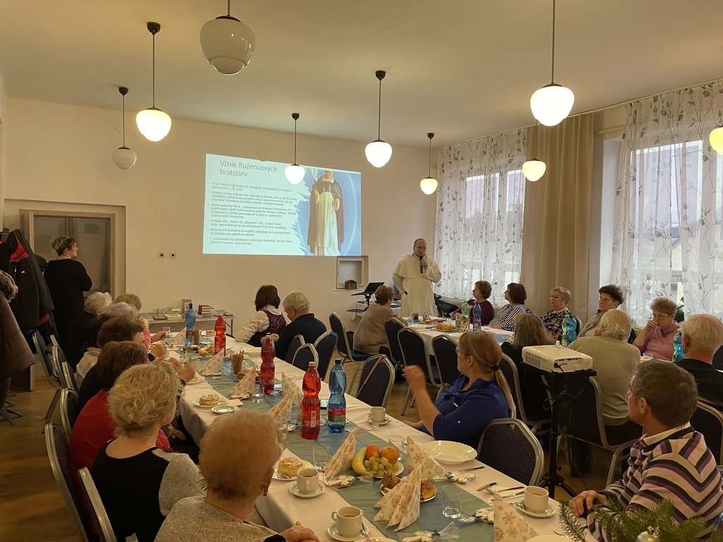 Po slávnostnom požehnaní, po svätej omši sa naši bratia dominikáni, členovia RB a naši duchovní otcovia zišli v spoločenskej miestnosti obecného úradu na slávnostný obed. Po slávnostnom obede nasledovala prednáška, ktorú začal prednášať brat Joachim. Priblížil nám vznik, Stanovy a šírenie Živého, Svätého a Večného ruženca. V prednáške pokračoval brat Matej, vytvoril sa priestor na otázky, ktoré nám jasne a zrozumiteľne zodpovedal. Predstavil nám ako má fungovať RB a čo bude nasledovať najbližšie týždne, keďže v našej dedinke ešte nebola duchovná obnova, preto je potrebná aj reforma. Chceme kráčať po vzore našich predkov, uchovať si RB, nie iba ako tradíciu, ale ako živé modlitbové spoločenstvo.