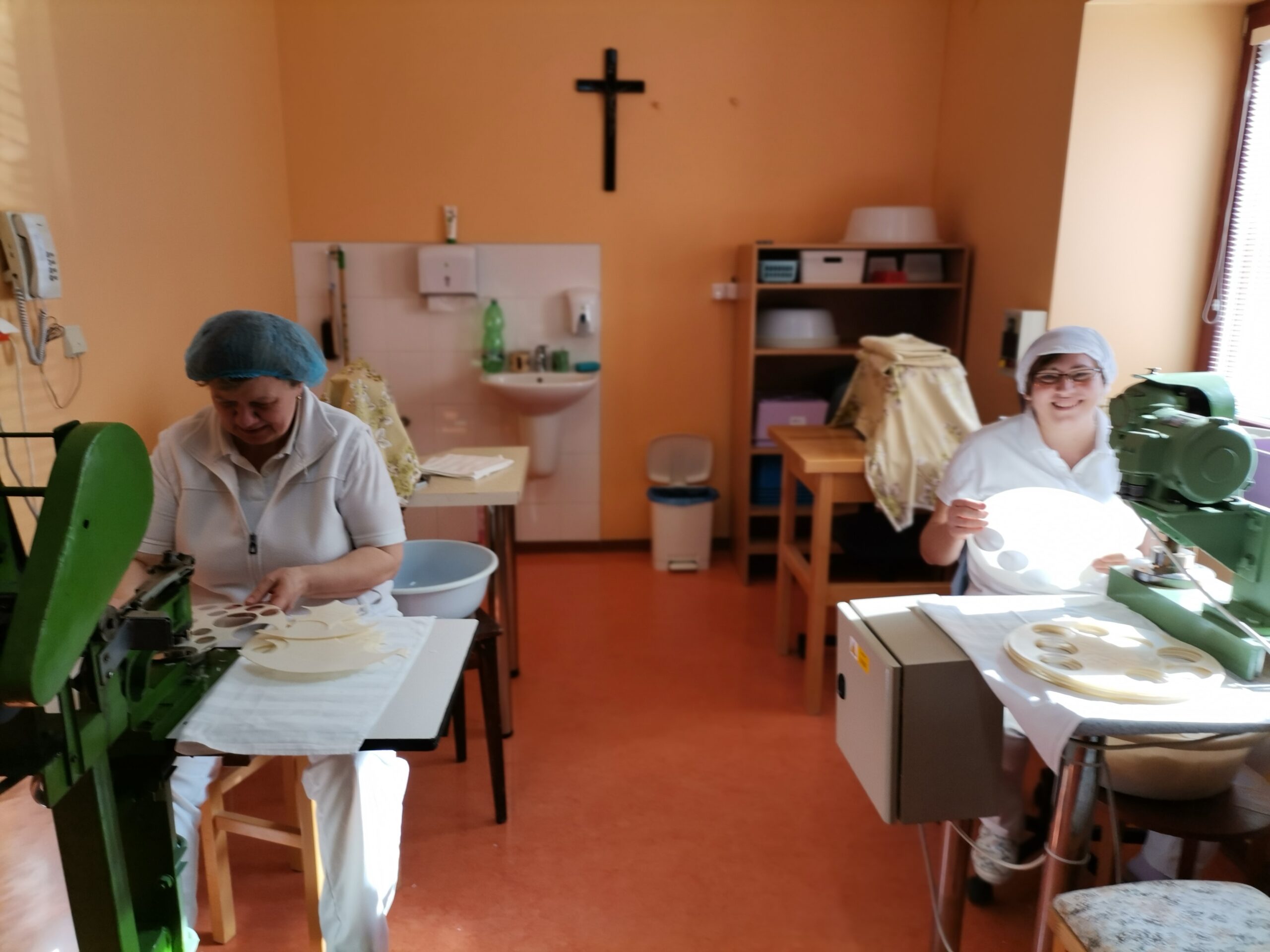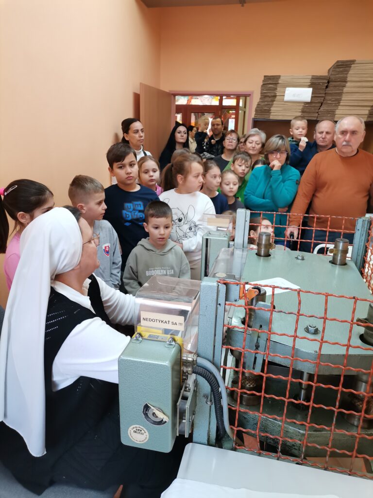 Chceli sme im priblížiť ako sa vyrábajú hostie, koľko práce je za tou malou oblátkou. Čakalo nás milé privítanie sestrou Klarissou, vedúcou výrobne hostií. Pútavou formou nám priblížila výrobu hostií. Je to práca ťažká, sprevádzaná modlitbami. Okrem sestier z Congregatio Jesu, tam pracujú aj ženy laičky. Sestry pečú hostie už vyše 100 rokov a je to jediná výrobňa hostií na Slovensku. Patrónom výrobne hostií je sv. Pius X.